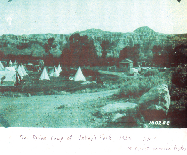 In 1914, the Wyoming Tie & Timber Company began cutting railroad ties in the Togwotee Pass. Ties were also cut in Union Pass where the remains of some of the old log flumes may still be seen. The ties would be floated down the Wind River to Riverton for use on the Chicago and Northwestern. Tie Hacking in Wyoming, however, dates back to the coming of the Union Pacific in 1868 when tie hack camps sprang up in the Medicine Bow Mountains to serve the Railroad. At the beginning of the 20th Century, tie hack camps were located in the Big Horn and Wind River Mountains. Tie camps all bore a similar structure. There was a headquarters camp which included a commissary, possibly a small school, provision for mail and housing. The headquarters camp for the Wyoming Tie & timber Company was at DuNoir near the present site of the Brooks Lake Lodge. Out in the woods there would be smaller subordinate camps.